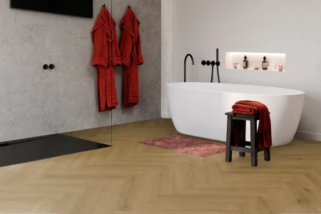 Looking to add a touch of elegance to your bathroom? No problem with Parquetvinyl. With a herringbone vinyl floor , you can turn your daily bathroom routine into a luxurious moment of pampering. A warm, comfortable feel underfoot and a luxurious floor finish? Check.