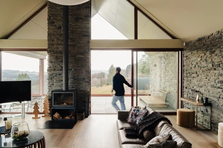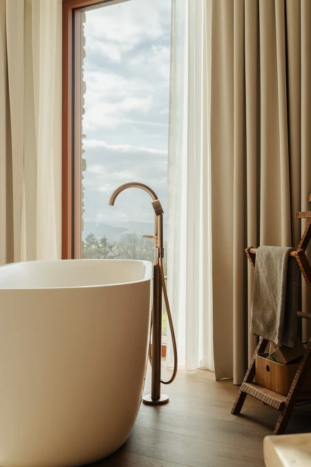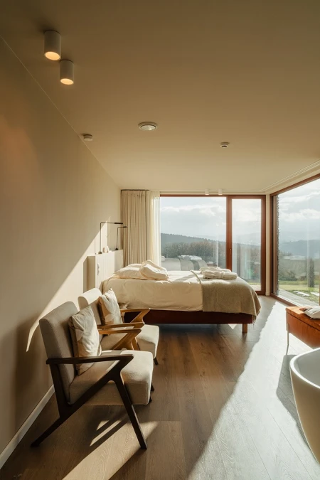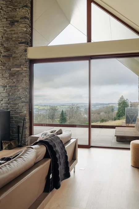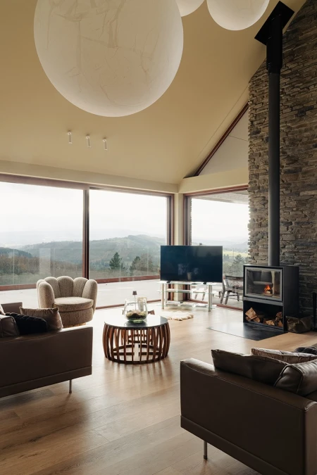 Upon arrival, the breathtaking view immediately catches the eye. Thanks to the large windows, the panoramic landscape is brought inside like a living painting. An open layout was deliberately chosen to allow light and space to take center stage. Every detail in the interior reinforces that feeling of harmony with nature.